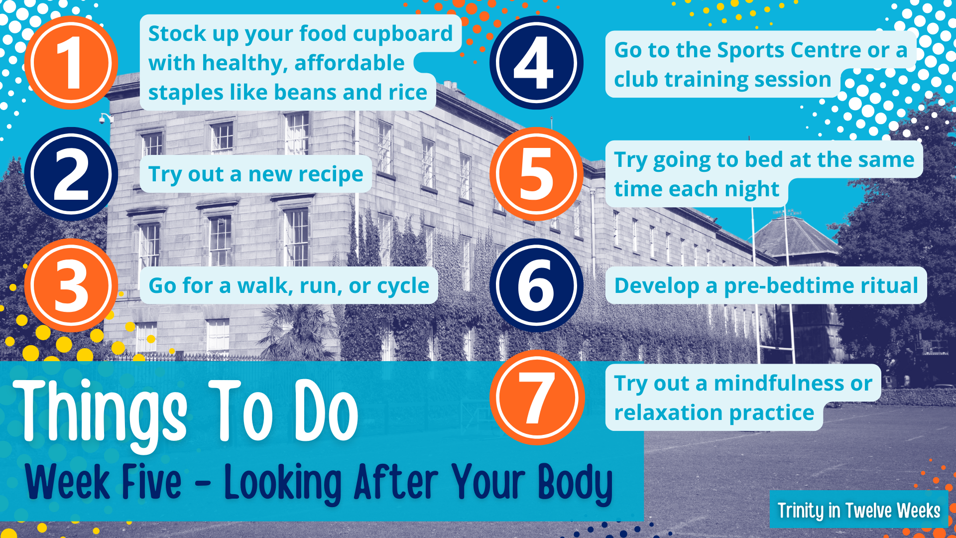 The infamous “freshers’ flu” usually peaks around now, but it can hit anyone who’s overworked and underslept. Keep your immune system happy: eat real food, drink water, sleep, and take breaks. Don’t be afraid to rest - missing one night out beats dragging yourself through a week half-sick. Trinity’s Student Health Centre is there for a reason; if you’re feeling run down, it’s better to check in early than let it spiral.